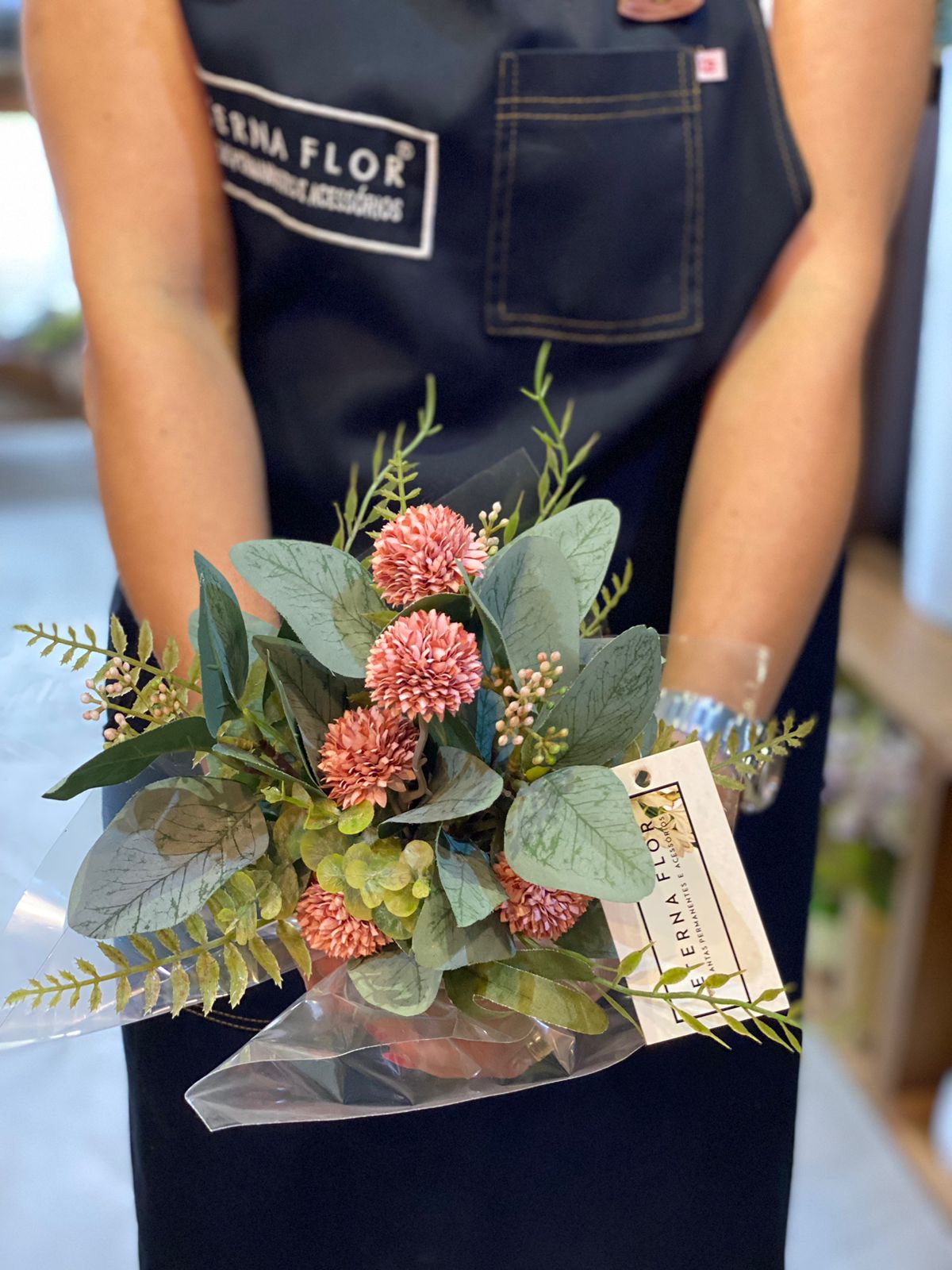 Mini buquê com folhas de eucalipto em tecido verde e em plástico verde, pequenas sementes rosadas em plástico e florzinhas de cravo em tom rosado.